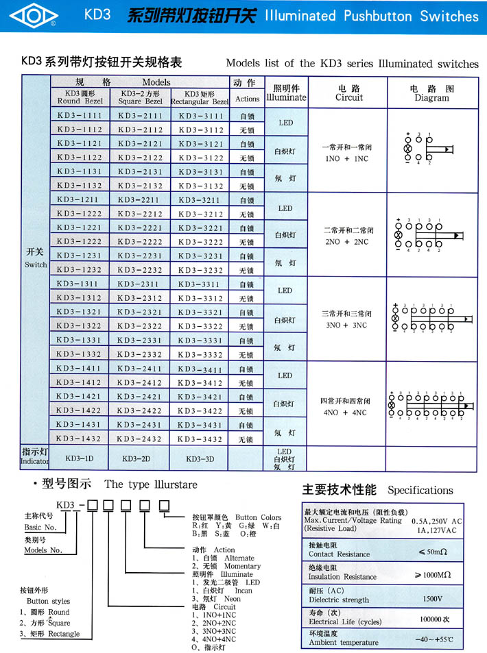 • KD3系列帶燈按鈕開 產(chǎn)品型號(hào):KD3系列帶燈按鈕開